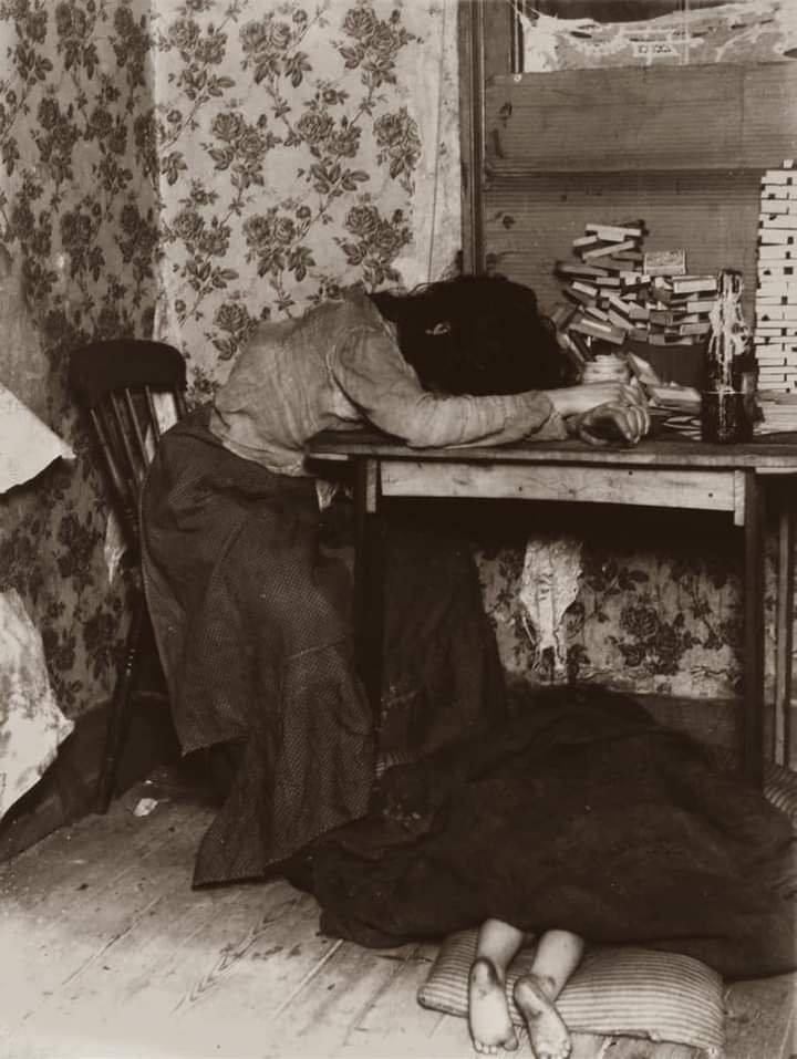This photograph shows a young Mother, exhausted from spending hours making matchboxes, a pile of which can be seen on the table. At her feet is a young, sleeping baby covered by a blanket. For such homeworkers engaged in the sweated industries there was no division between work and home life. Match-box making was amongst the lowest paid work.